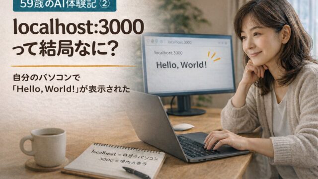 localhost:3000とは何か?Claude Codeを使って初めて表示された画面の意味を、59歳の初心者目線でわかりやすく解説。わからなくても大丈夫と感じられる体験ベースの記事です。