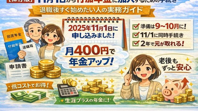 退職後に付加年金を始めるなら、9〜10月の準備がカギ。この記事では「11月1日から加入」できるよう、必要書類・窓口・前納割引の活用まで実務目線で詳しく解説。月400円で一生リターンが続く安心制度を、今日から始めませんか?